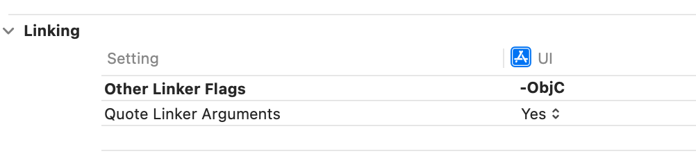 따라서 보통의 상황이라면 UI 의 Other linker flags 에 -Objc 를 설정하면 문제가 해결될 것입니다.