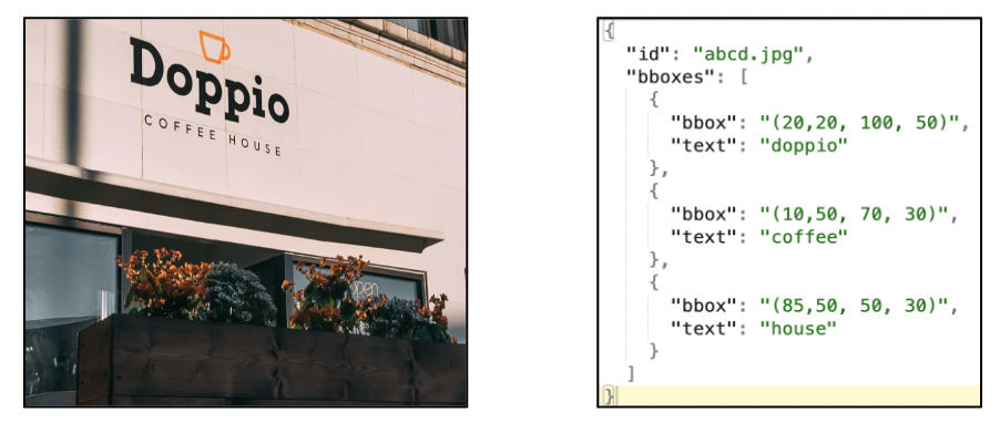 Text Region Detection 기능과 Text Recognition 기능은 Machine Leaning 기법으로 학습된 Model을 이용하게 되는데 최근에는 대부분 Deep Learning을 활용한 학습 Model을 이용하고 있습니다. Deep Learning을 이용한 Model 학습을 위해서는 다량의 학습 데이터 셋을 필요로 하게 됩니다. 학습 데이터는 대상 이미지와 이미지 내 문자열들의 위치 그리고 정답 문자열 정보를 포함하고 있습니다.