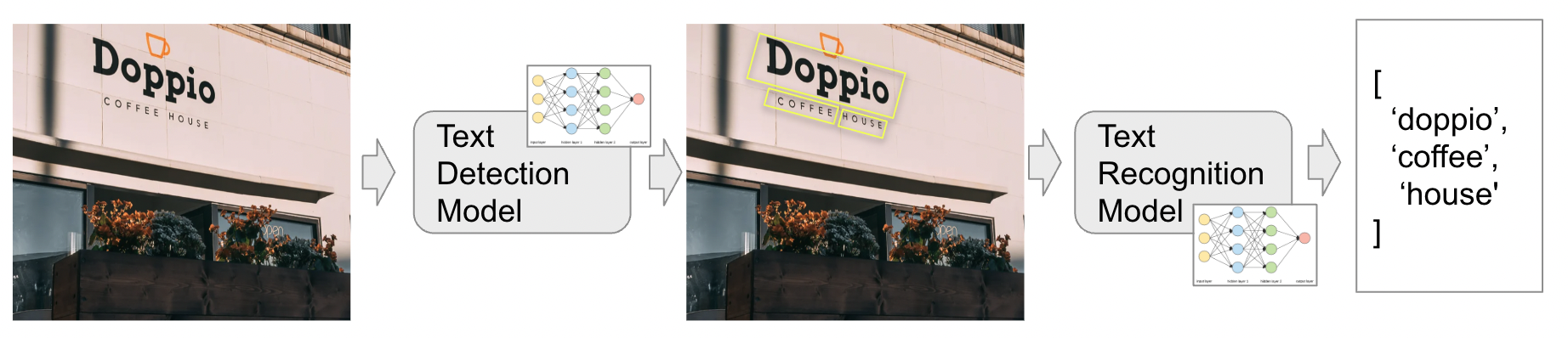 OCR 기능은 이미지 내 문자열들의 영역과 위치를 찾아내는 Text Region Detection 기능과 Text Region 내 문자열들의 실제 문자열을 추출하는 Text Recognition 기능으로 나누어집니다.