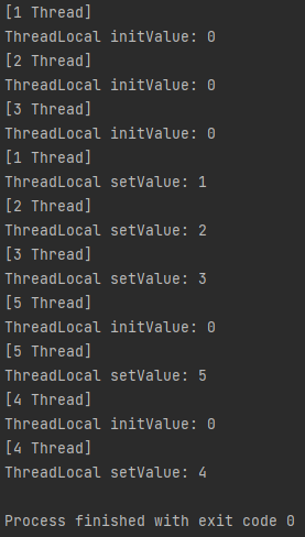 그에 대한 결괏값은 다음과 같이 각각의 초깃값은 0으로 세팅되어있고, 각 Thread의 번호를 출력하는 것을 확인할 수 있습니다.