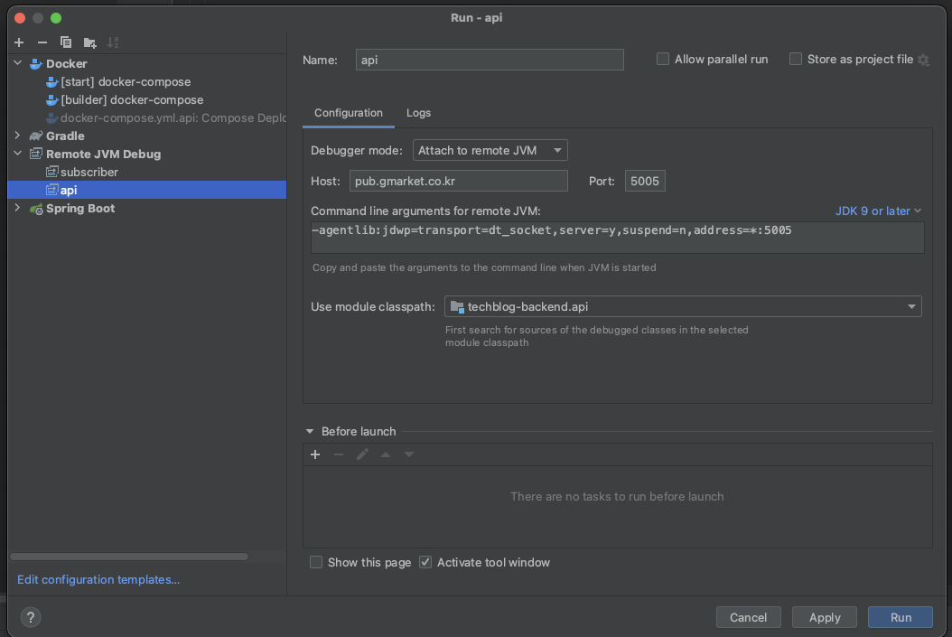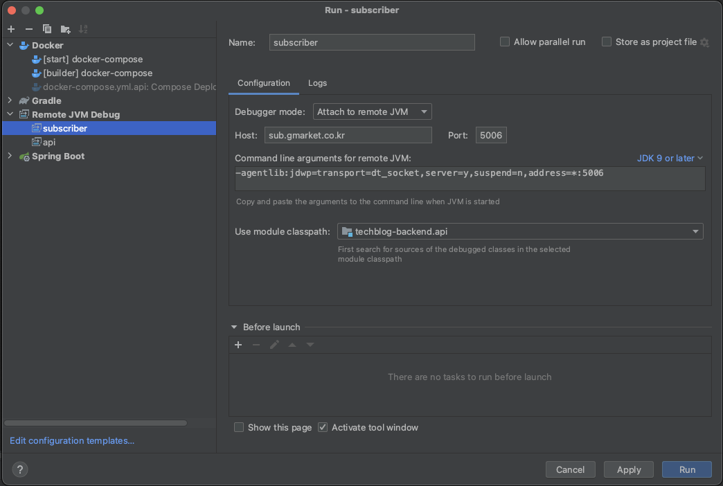 Run Configuration > Remote JVM Debug을 통하여 api와 subscriber 디버그 항목을 생성하고 아래 그림처럼 설정 해줍니다.- 어플리케이션을 실행한 상태에서 방금 생성한 Remote JVM Debug를 실행하고 원하는 위치에 break point 설정하면 디버그 모드를 확인할 수 있습니다.
