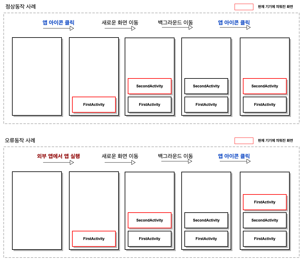 그래서 버그현상은 외부 앱에서 실행하는 방법과 아이콘을 클릭하여 실행하는 방법이 교차되었을 때 backstack에서 문제가 발생하는 것임을 알 수 있었습니다.