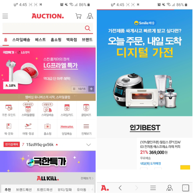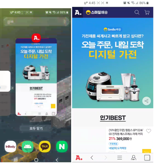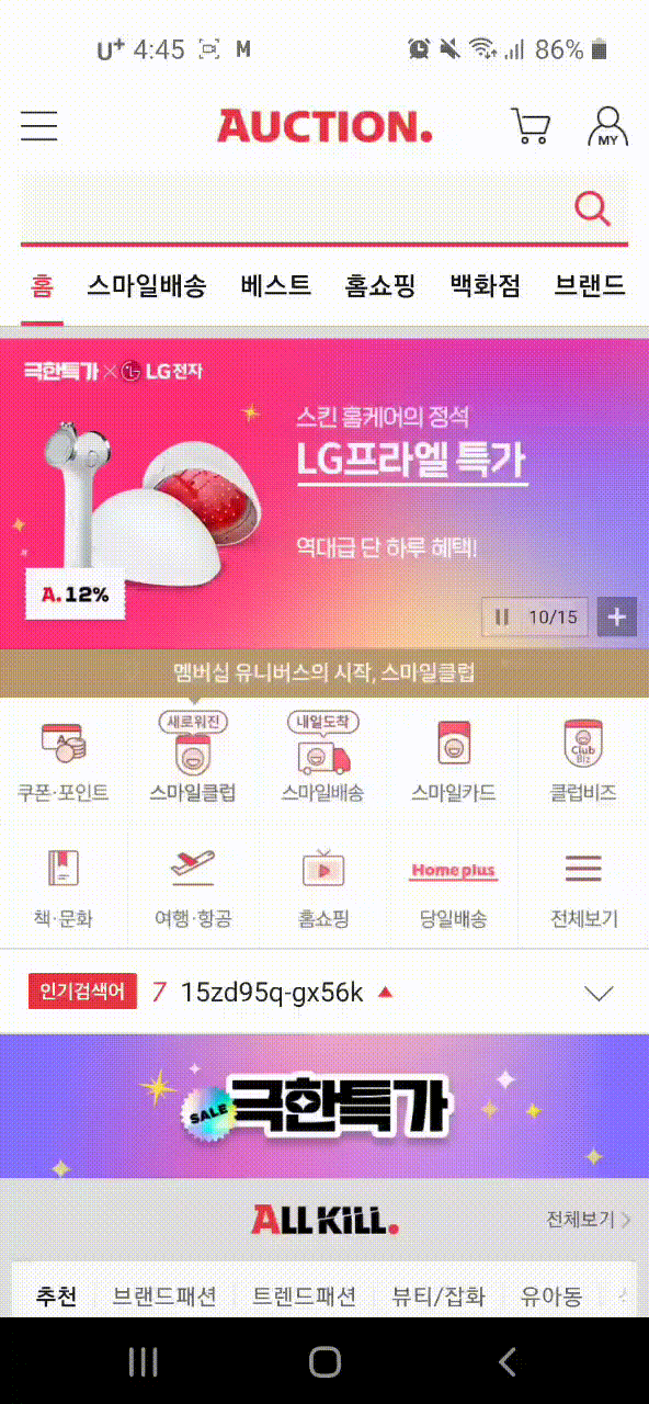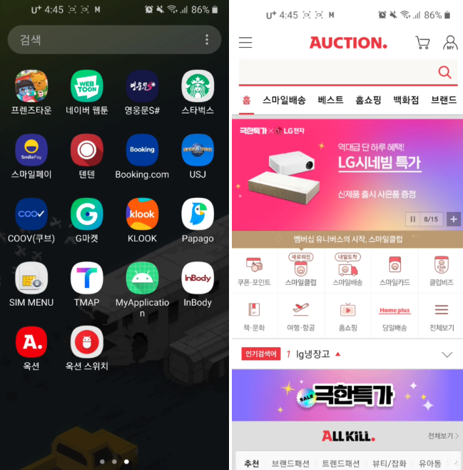 그래서 "플레이스토어" 앱을 통해 옥션을 실행해 보았을 때에도 동일한 결과가 나타나는지 테스트를 진행해 보았습니다.