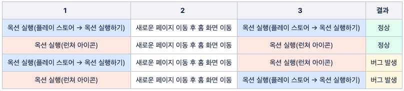 위와 같은 결과로 미루어보았을 때 외부 앱에서 실행하는 방법과 아이콘을 클릭하여 실행하는 방법이 교차되는 것이 원인에 큰 영향을 미치지 않을까 짐작하였습니다.