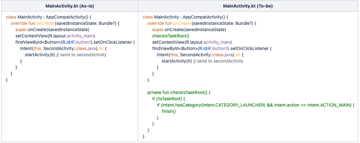 그렇기에 Intent.CATEGORY_LAUNCHER 와 Intent.ACTION_MAIN 플래그와 함께 MainActivity 에 진입하였을 때 현재의 Activity 가 taskRoot 가 아니면 위 문제 상황이 발생한 것으로 인지하고 finish() 처리를 통해 Activity 를 종료하면서, 가장 최근 backstack에 남 아있는 Activity 가 포그라운드로 올라오도록 할 수 있습니다.