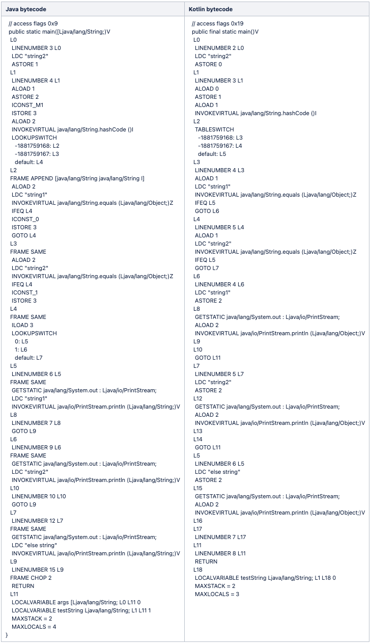 분기 처리가 길어질 경우 switch/when 구문에서 string 을 사용하는 것이 if-then-else 사용보다 더욱 효율적입니다. 그 이유는 if-then-else 와 다르게 switch/when 는 바이트코드상에서 각각 LOOKUPSWITCH / TABLESWITCH 실행구문을 통해 작업을 최적화하기 때문입니다.