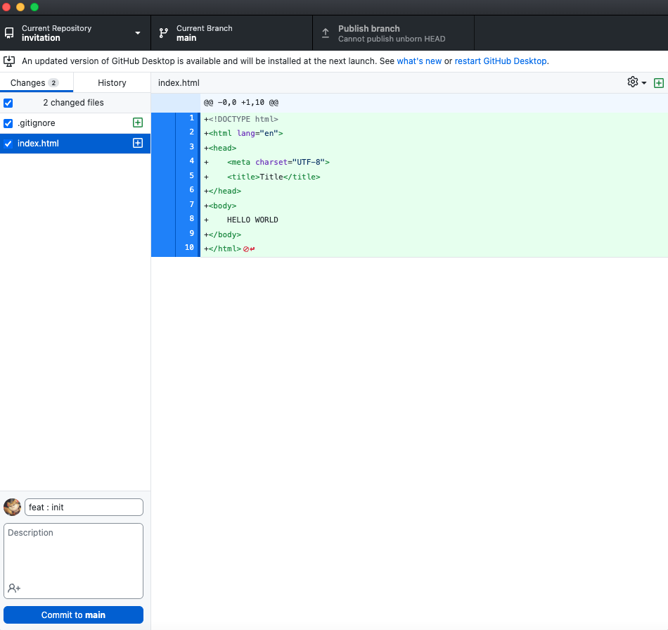 그리고 해당 repository를 clone 받아서 index.html 이라는 이름으로 페이지 하나를 임시로 만들어 놓고 채 commit-push 합시다.