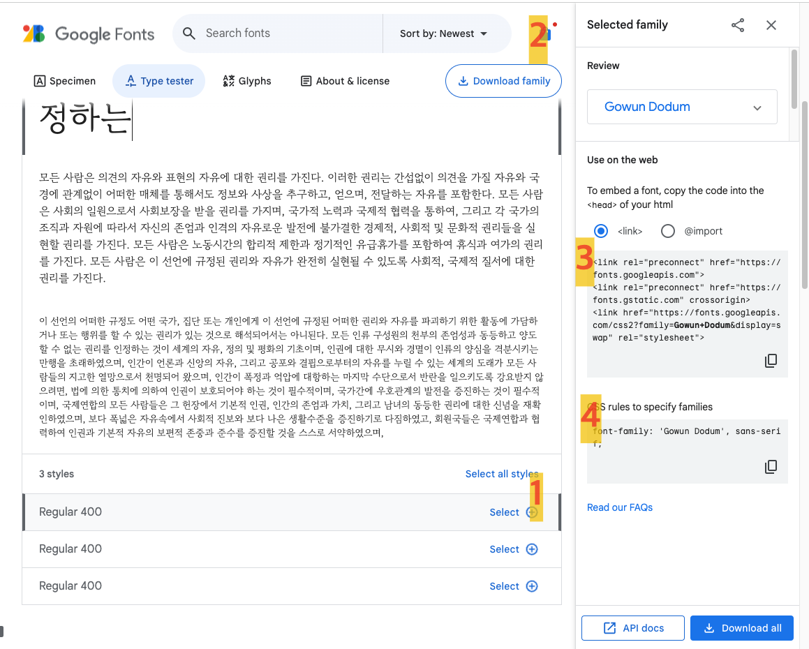 폰트를 선택하려면, select 버튼을 클릭하세요. 선택한 폰트는 우측 상단의 family 섹션에 추가됩니다. 여기서 web 코드를 복사하여 HTML의 head 부분에 붙여넣고, 필요한 폰트 스타일을 style 태그 내에 적용하면 됩니다.