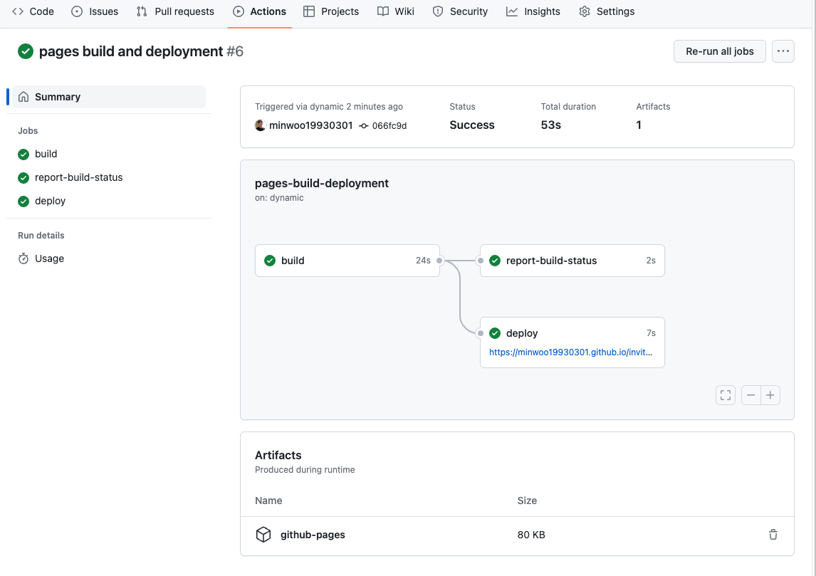 코드 변경 후에는 Github Actions (Jenkins와 유사한 CI/CD 도구)가 자동으로 빌드와 배포 과정을 시작합니다. 그러므로 코드 변경 후 바로 페이지에 반영되지 않을 수 있으므로 조금 기다려야 합니다.
