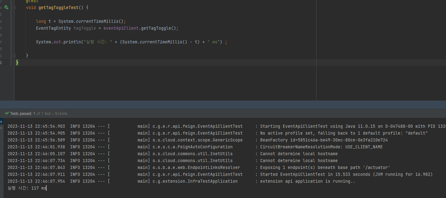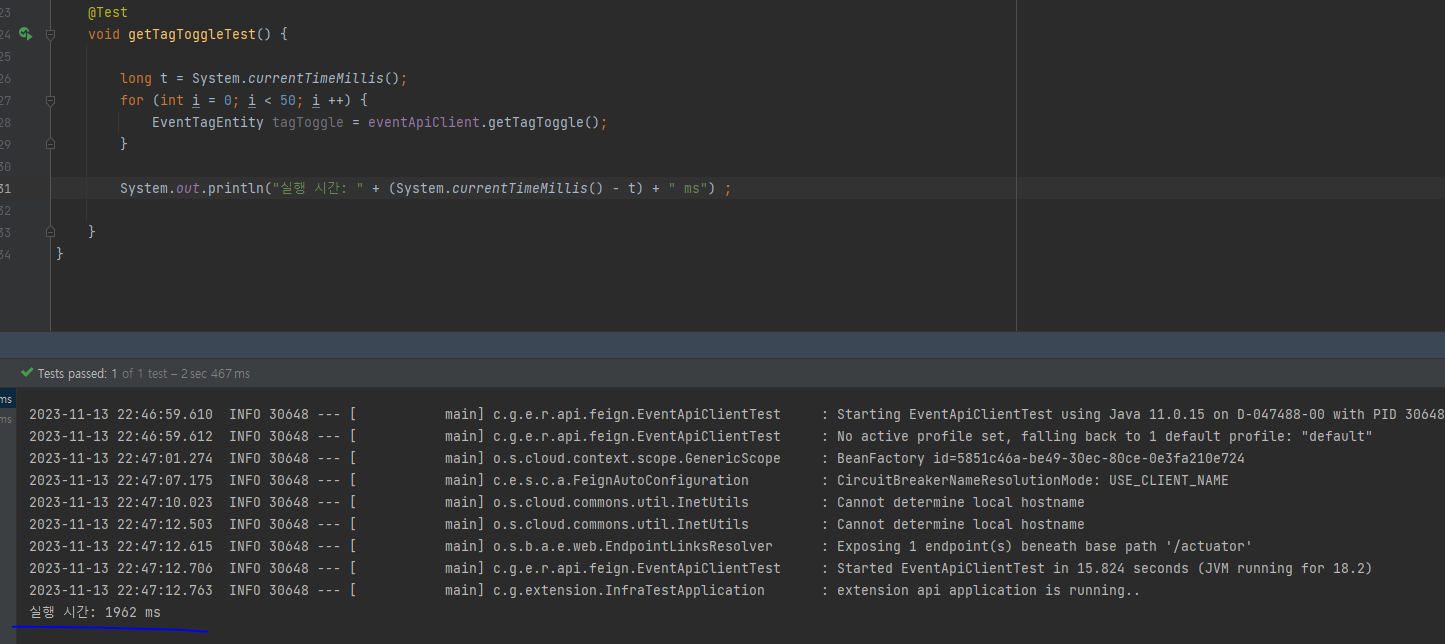 아래의 AS-IS 와 TO-BE 각각 100번 호출 결과 평균 0.05초의 성능이 개선되었습니다.