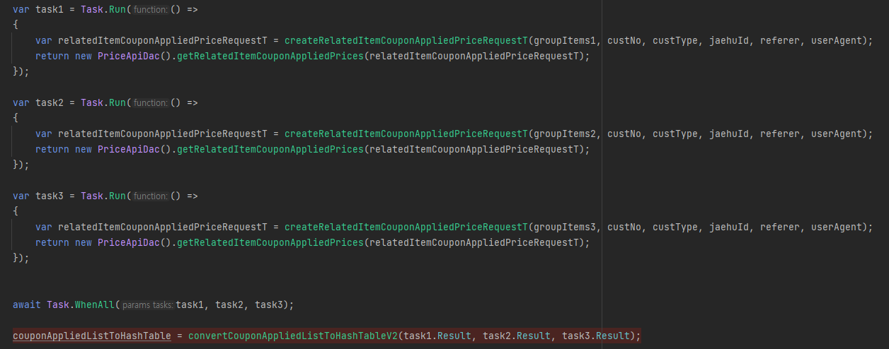 때문에 기존의 절차식&동기식 메소드 호출에서 병렬호출 구조로 변경을 해야만 했습니다.