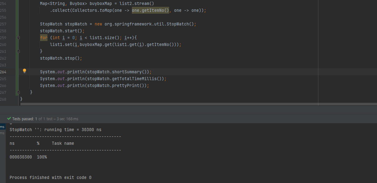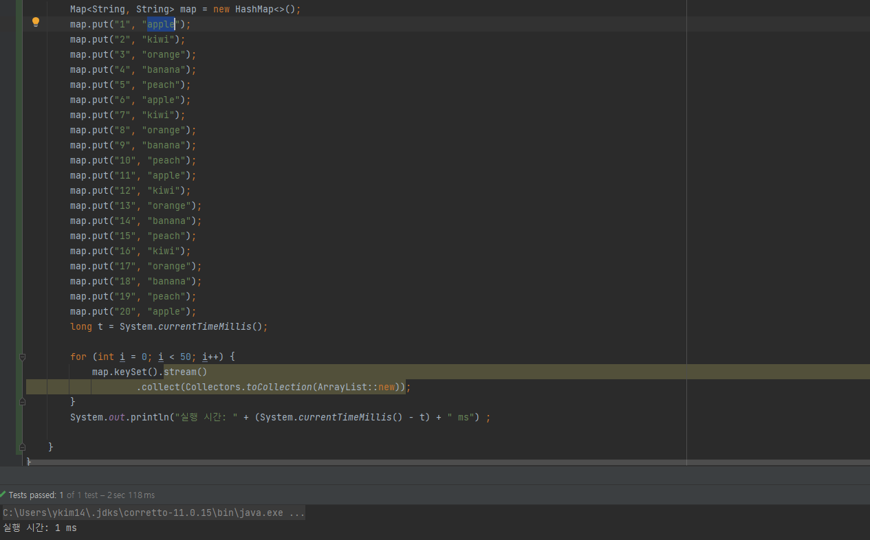 아래 예시는 HashMap에 20개의 데이터를 넣은 후 반복문 내에서 List로 변환하는 작업입니다.